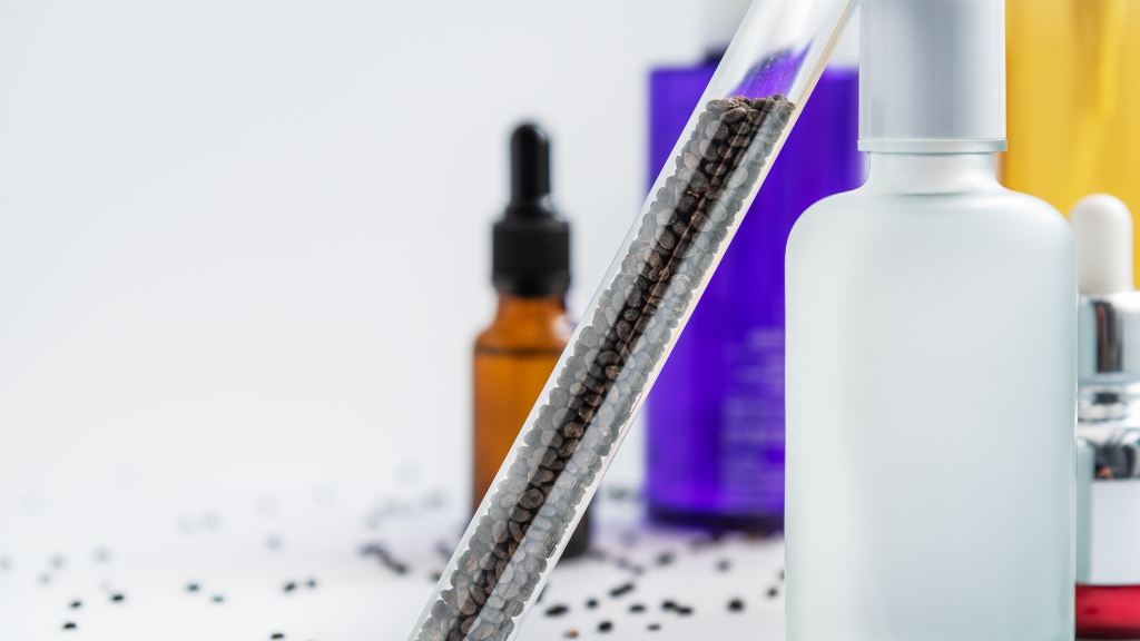 Staklene bočice u različitim bojama bacaju senke na belu podlogu, među rasutim crnim semenkama bakučiola